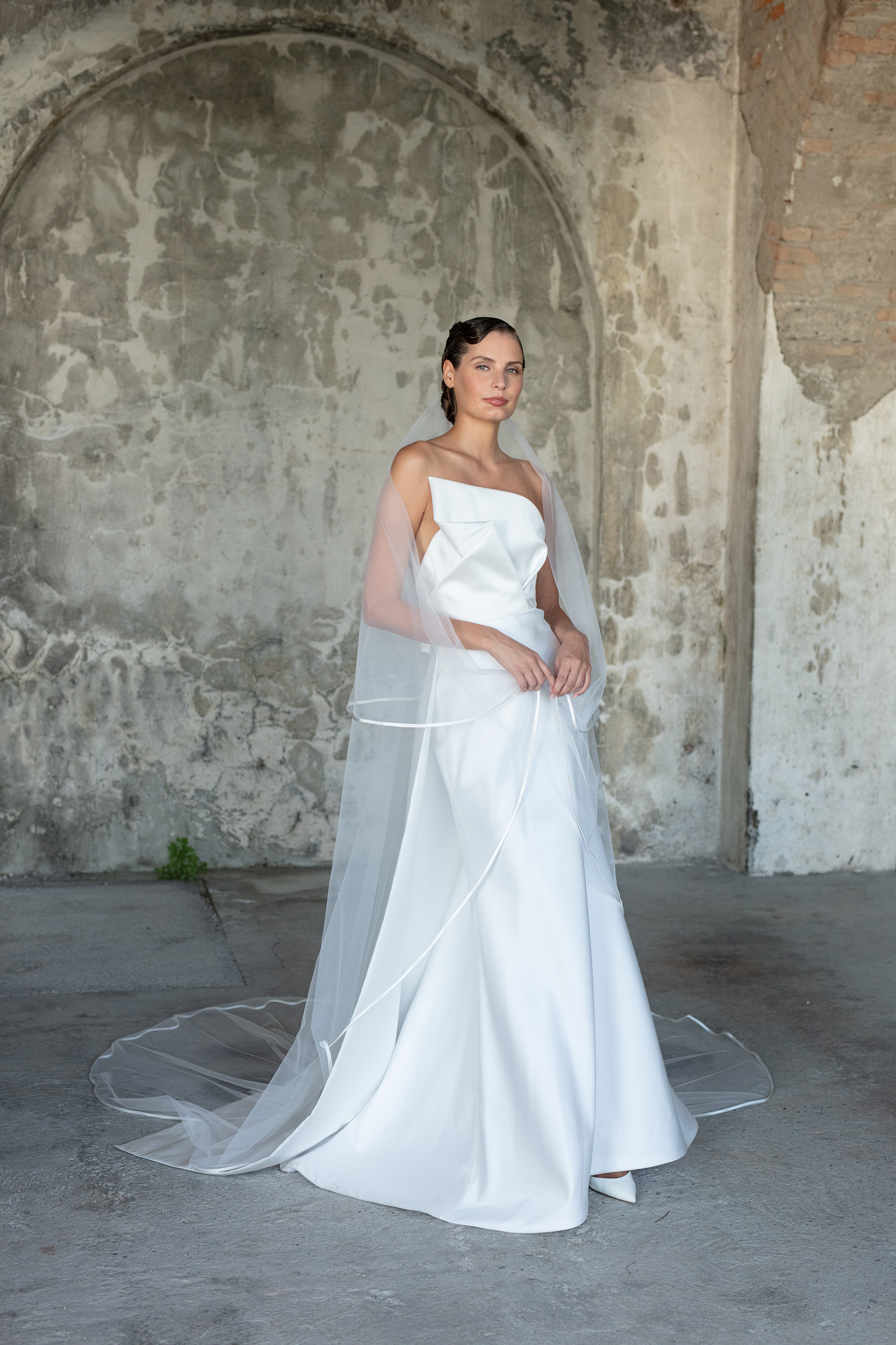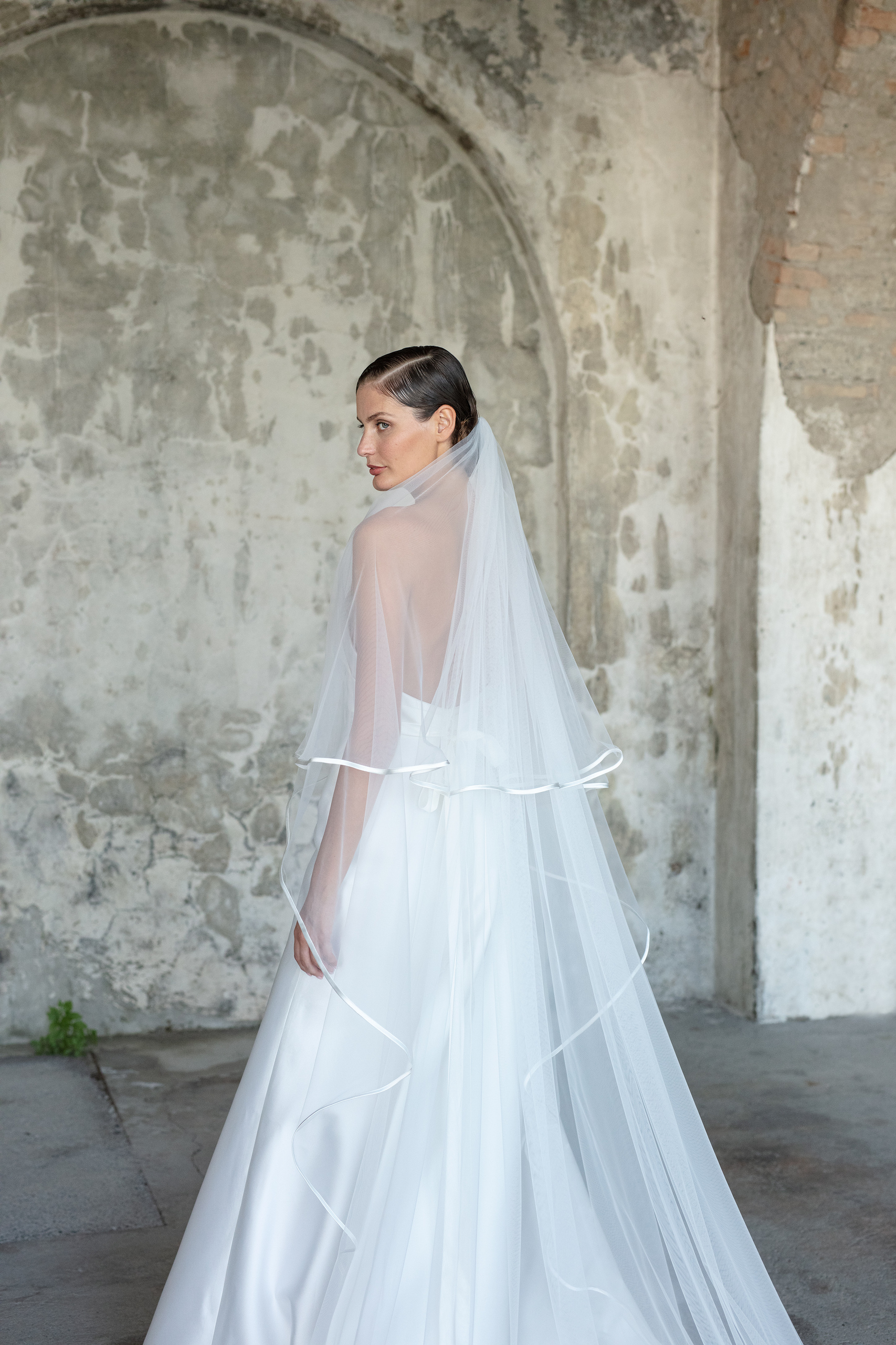 Il velo da sposa Vilmorin è un velo classico, con calata ed è pensato per diverse tipologie di abiti da sposa. Impreziosito da un sottile bordo di raso di seta, è elegante e raffinato.