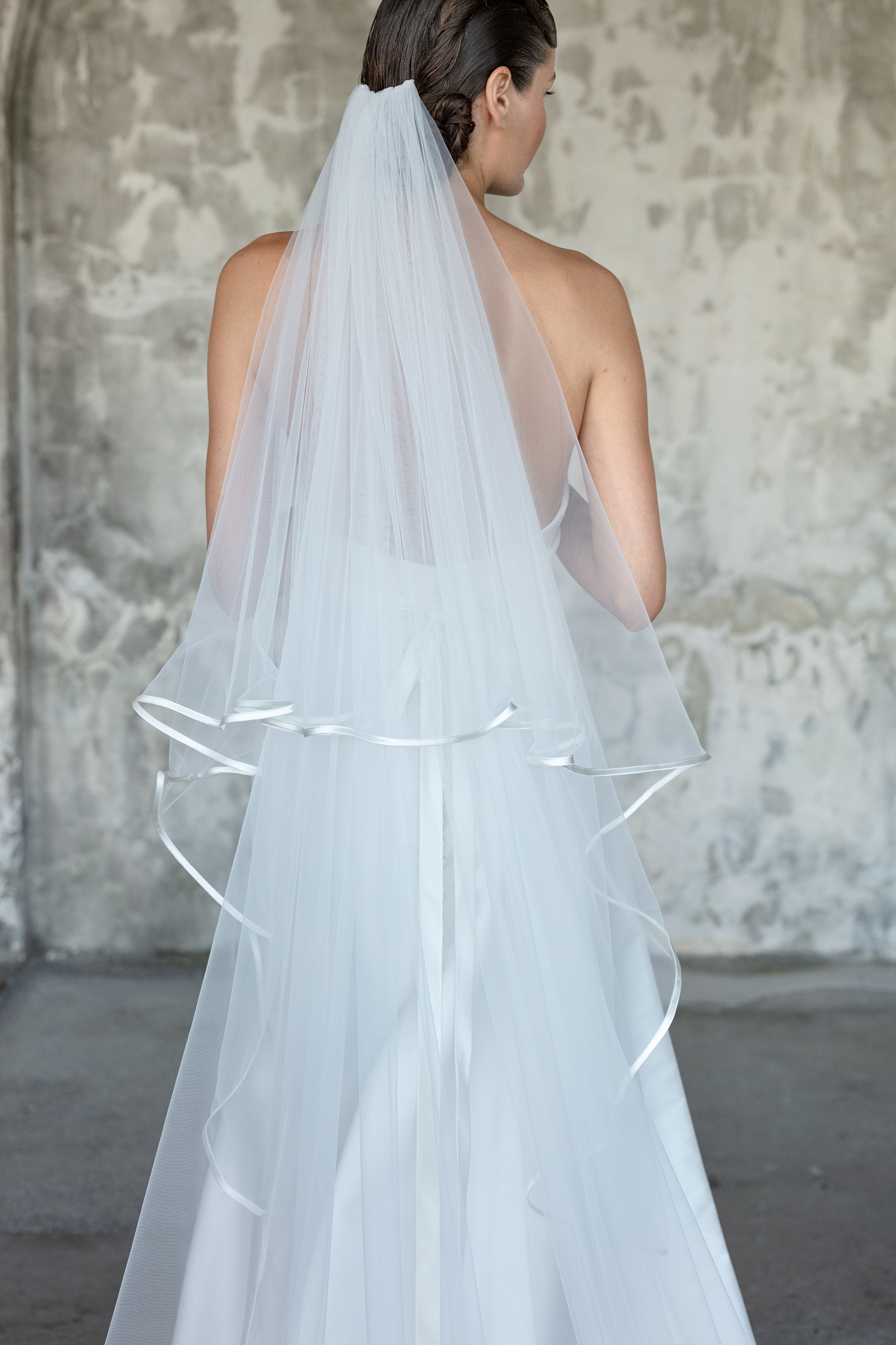 Velo in soft tulle 320 cm con calata (65 cm) e bordo di raso di 0,6 cm.