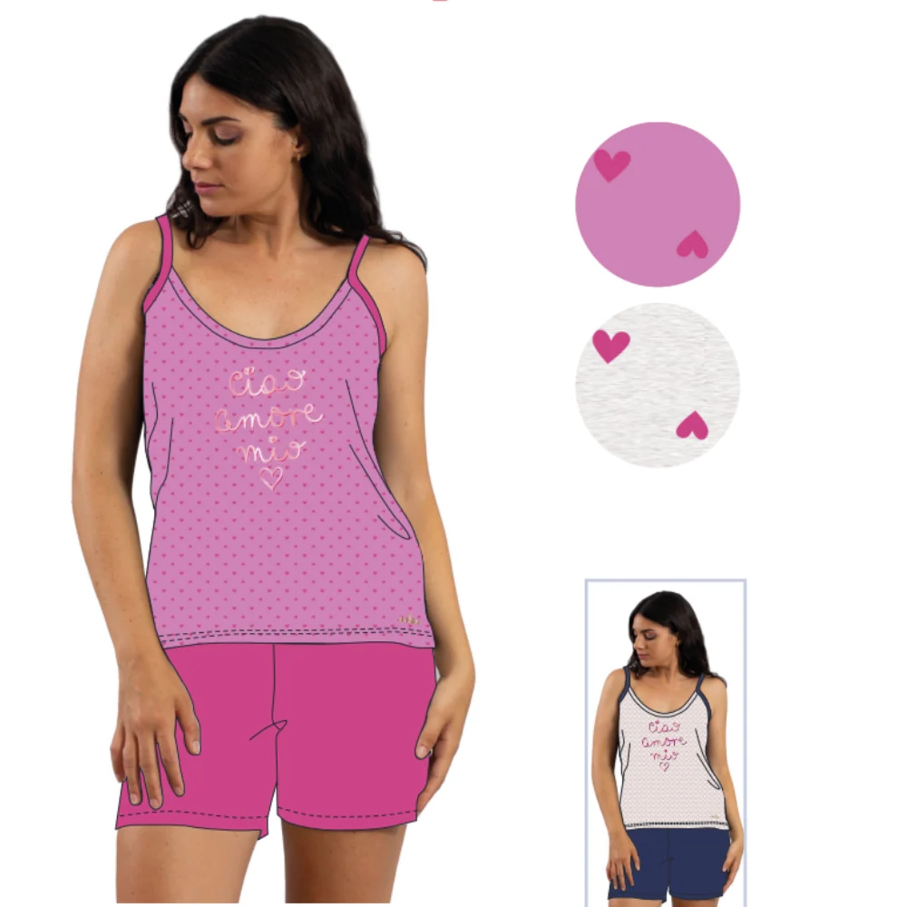 Ymc558 Pig – -you&me Estate- Pigiama Donna Corto Spalla Stretta Stampato In Puro Cotone