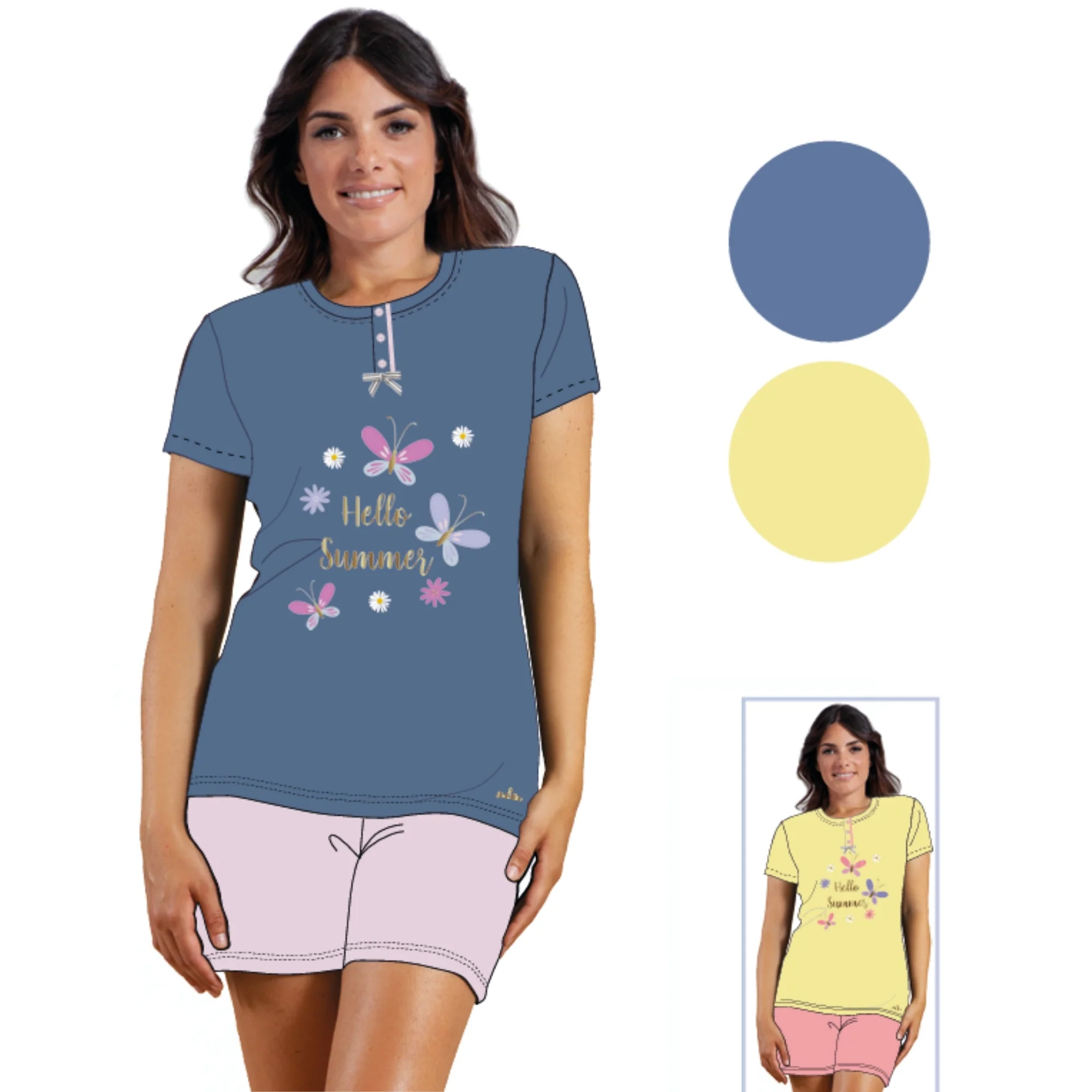 Ymc541 Pig – -you&me Estate- Pigiama Donna Mezza Manica Pantalone Corto Con Stampa In Puro Cotone