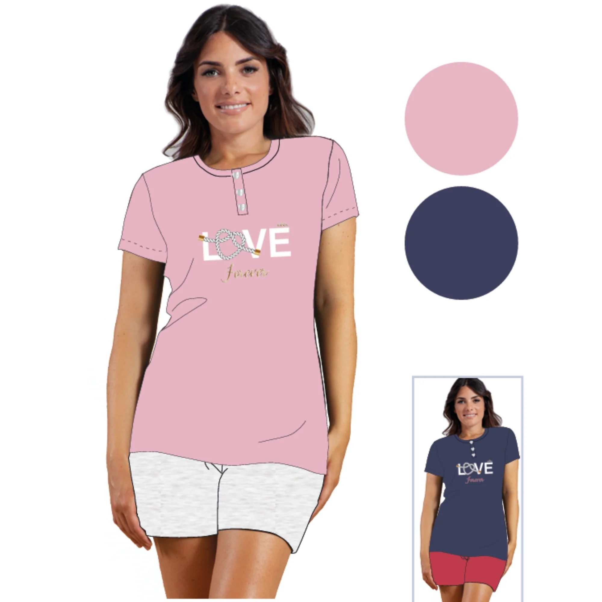 Ymc590 Pig – -you&me Estate- Pigiama Donna Mezza Manica Pantalone Corto Con Stampa In Puro Cotone