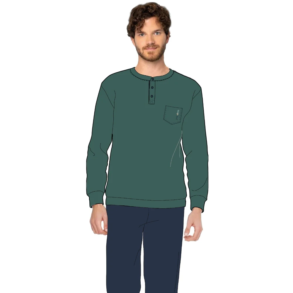 Ymi603 Pig – -you & Me Inverno- Pigiama Uomo Serafino 3 Bottoni Tinta Unita In Caldo Cotone Con Taschino