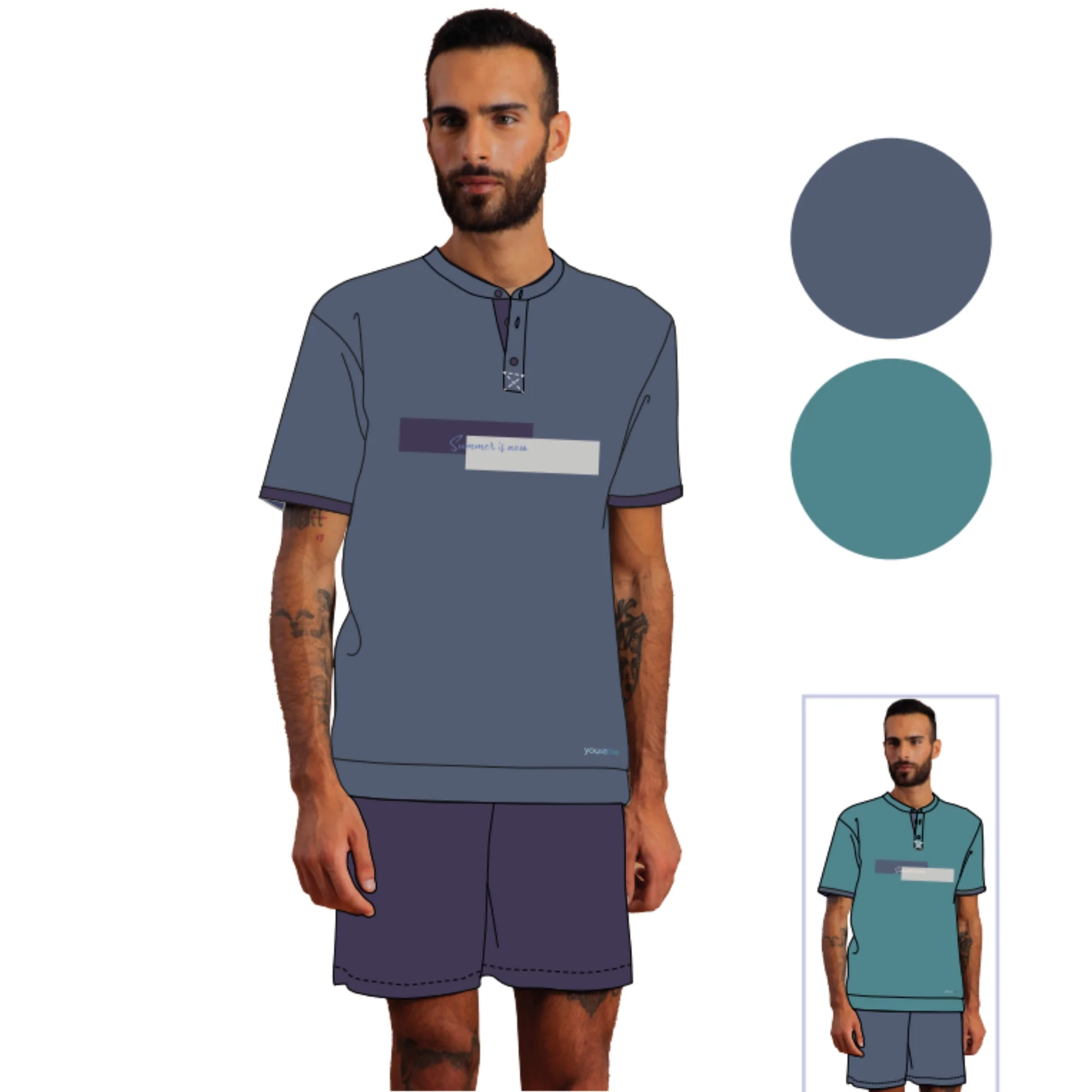 Ymc530 Pig – -you&me Estate- Pigiama Uomo Serafino Corto Mezza Manica In Jersey Puro Cotone Con Stampa