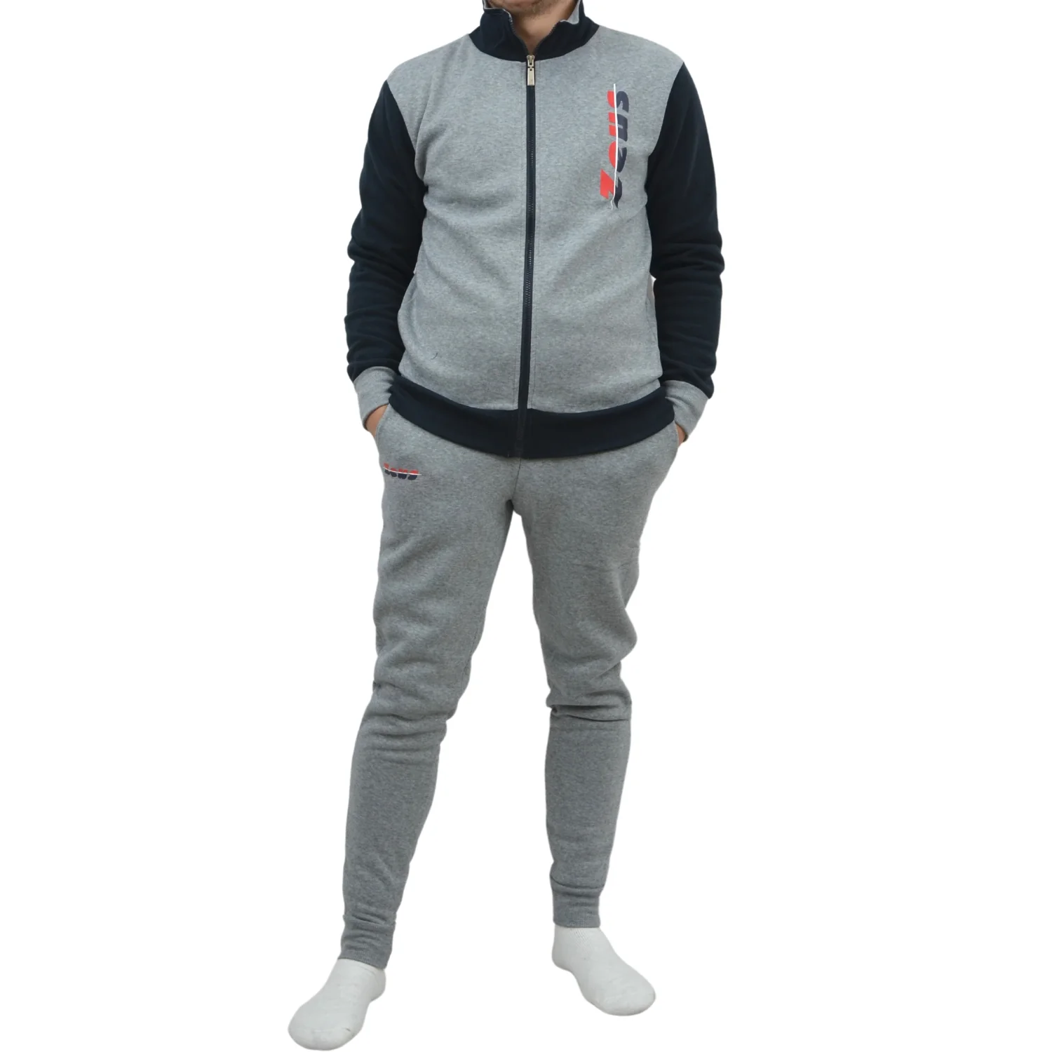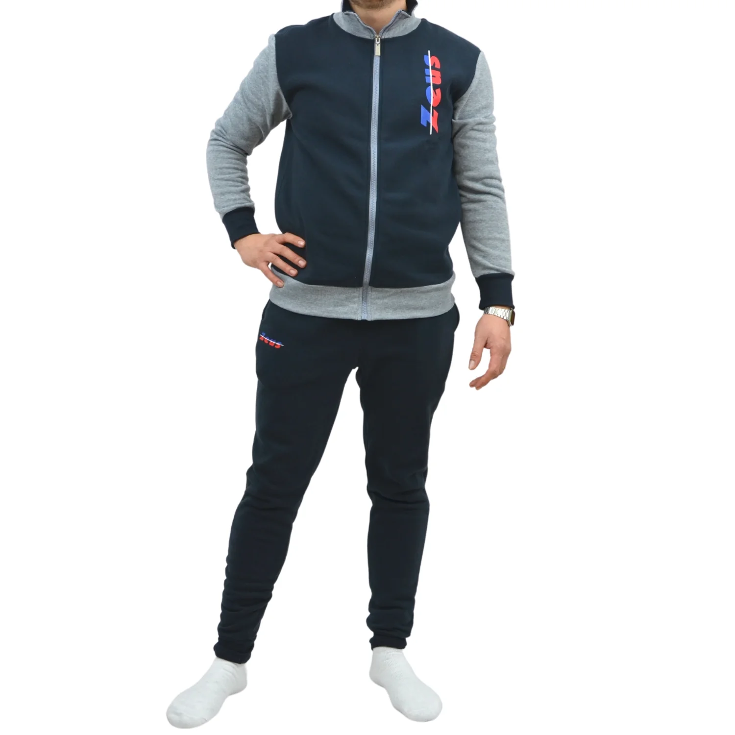 Zeus Tuta Uomo Full Zip In Felpa Pantalone Con Tasca E Elastico Alla Caviglia Blu Grigio Art.mz01